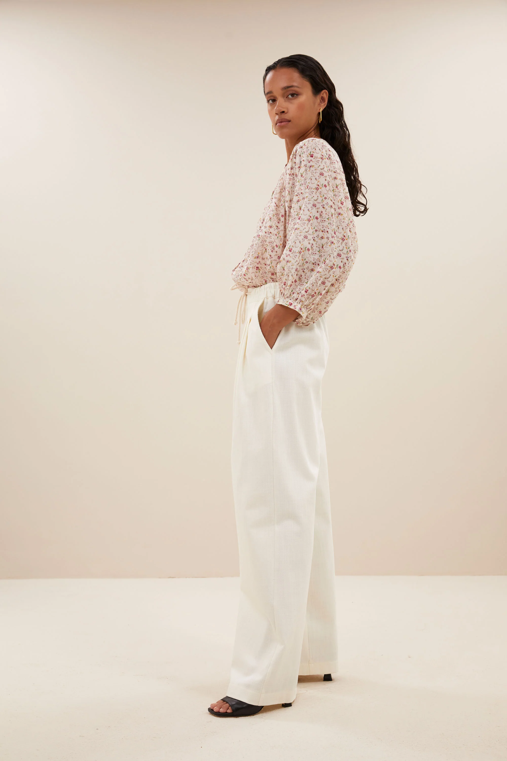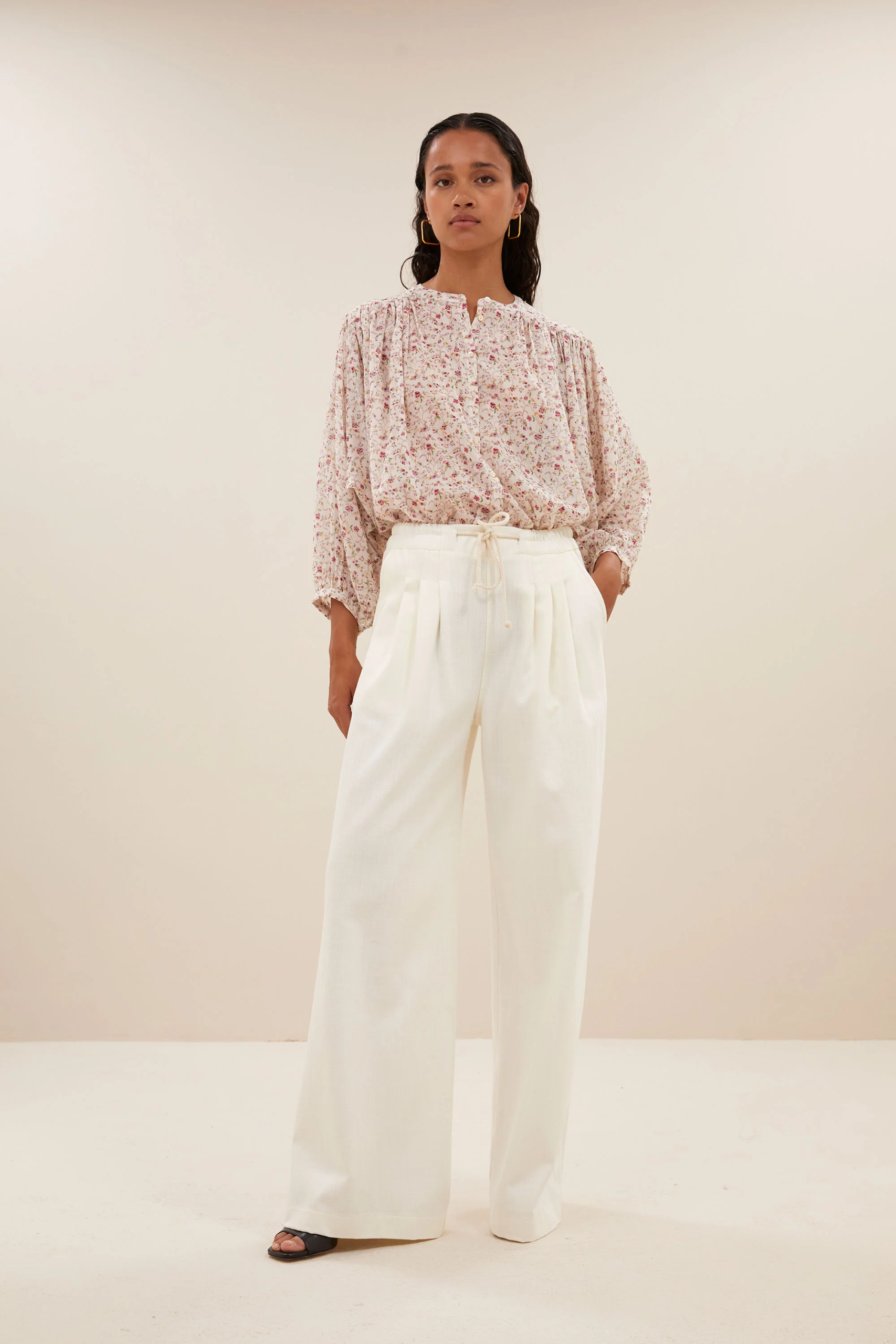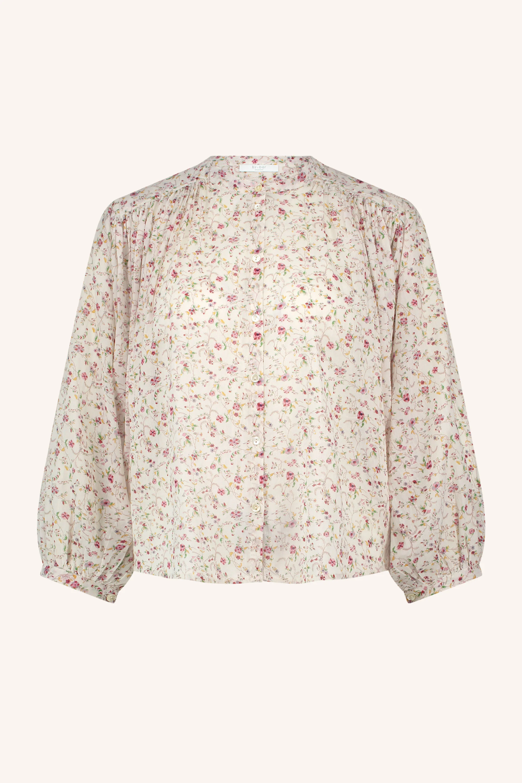 By Bar Bluse Becky, little flower. wunderschöner , zarter Mille-fleur Druck. Zarte Falten vorne, durchgängig geknöpft. Toller Schnitt durch voluminöse, halbe Ärmel. Funktioniert entweder reingesteckt in den Bund und luftig fließend.
