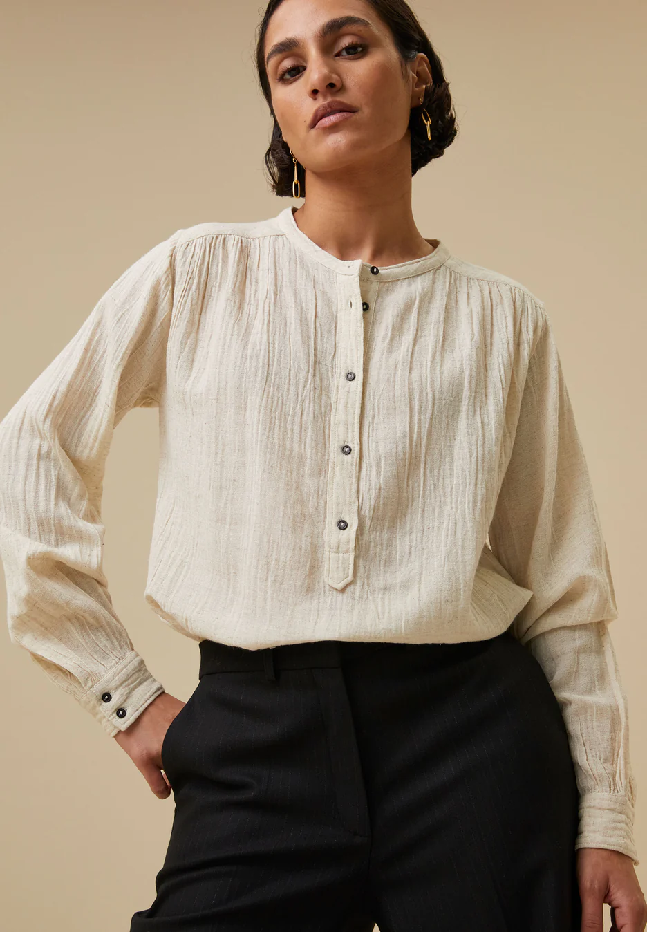 By-bar Amsterdam Linde Slub Bluse. Entspannte Bluse aus wunderbarem Baumwoll-Leinen-Mix. Schöne Detail wie Knopfleiste und zarte Falten. Lässt sich toll kombinieren.
