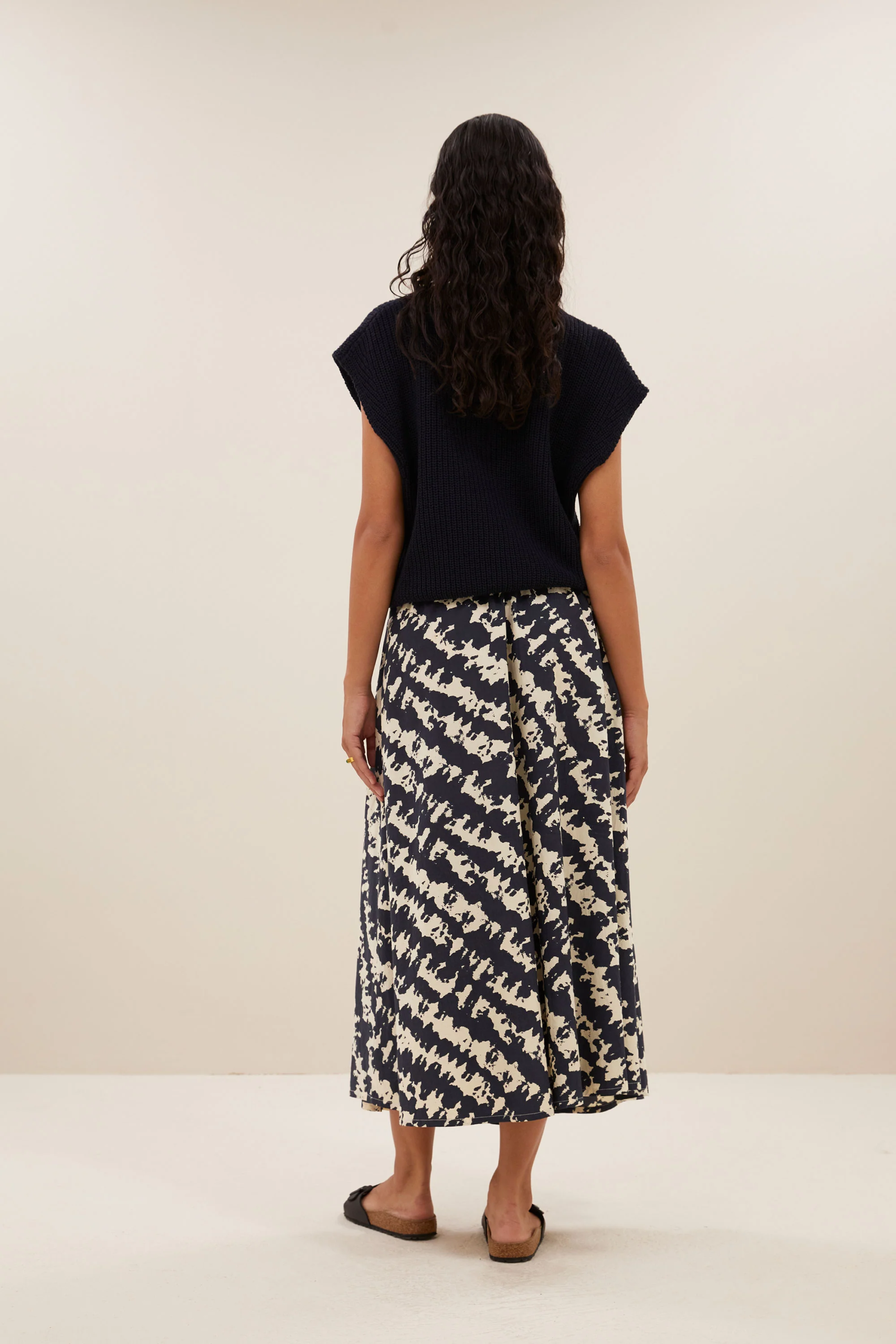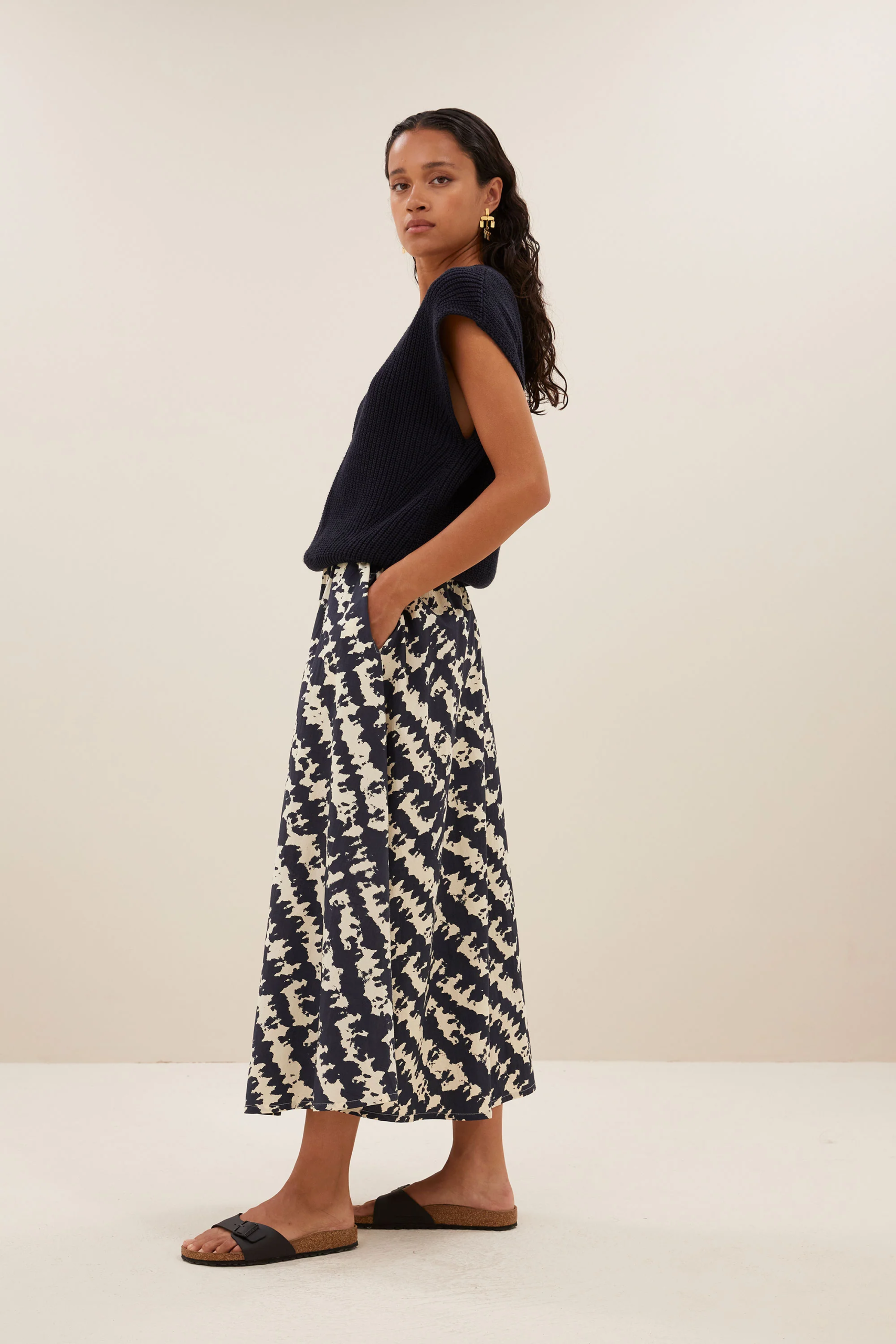 By bar Amsterdam Tock Juta. shade Print. Ein echter Alleskönner! Lässiger Baumwolleock in schöner Länge. Zwei Seitentaschen. Untergrund dunkelblau.