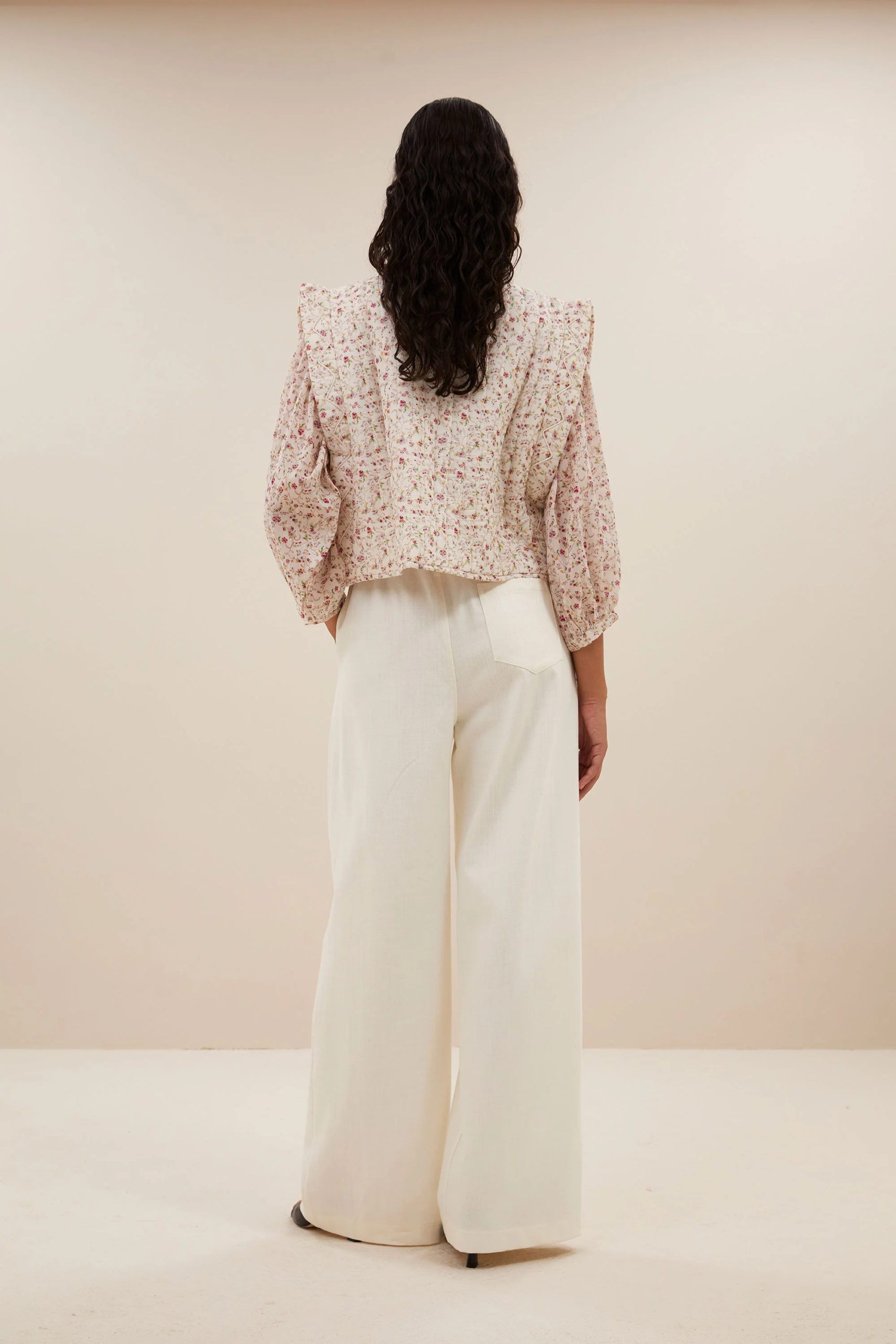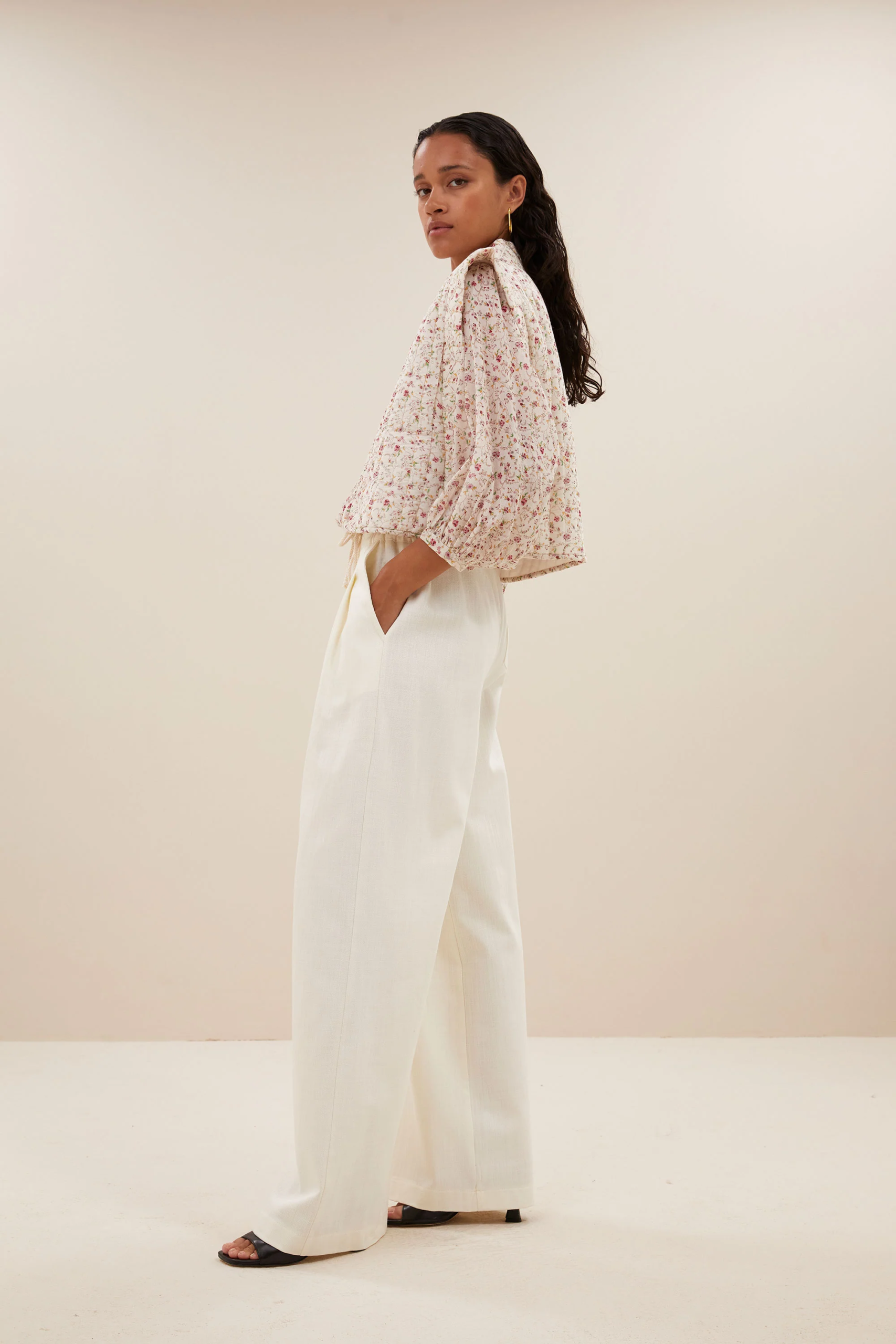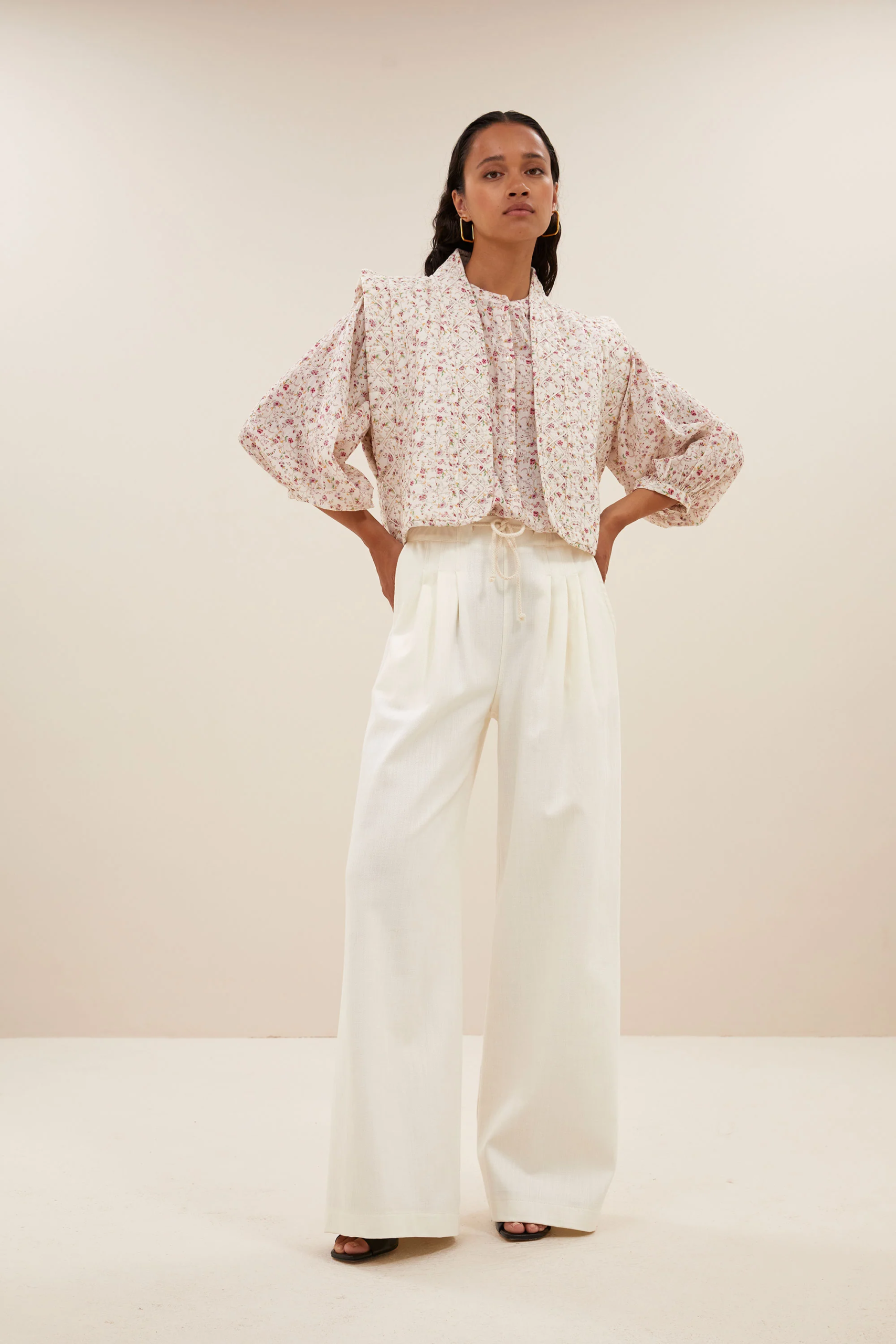 By Bar Amsterdam Weste Isla. Isla flower jacket. Little flower print. Zarter Mille-Fleur Print. Dezente Stickerei. Stehkragen und kurze Flügelärmel.