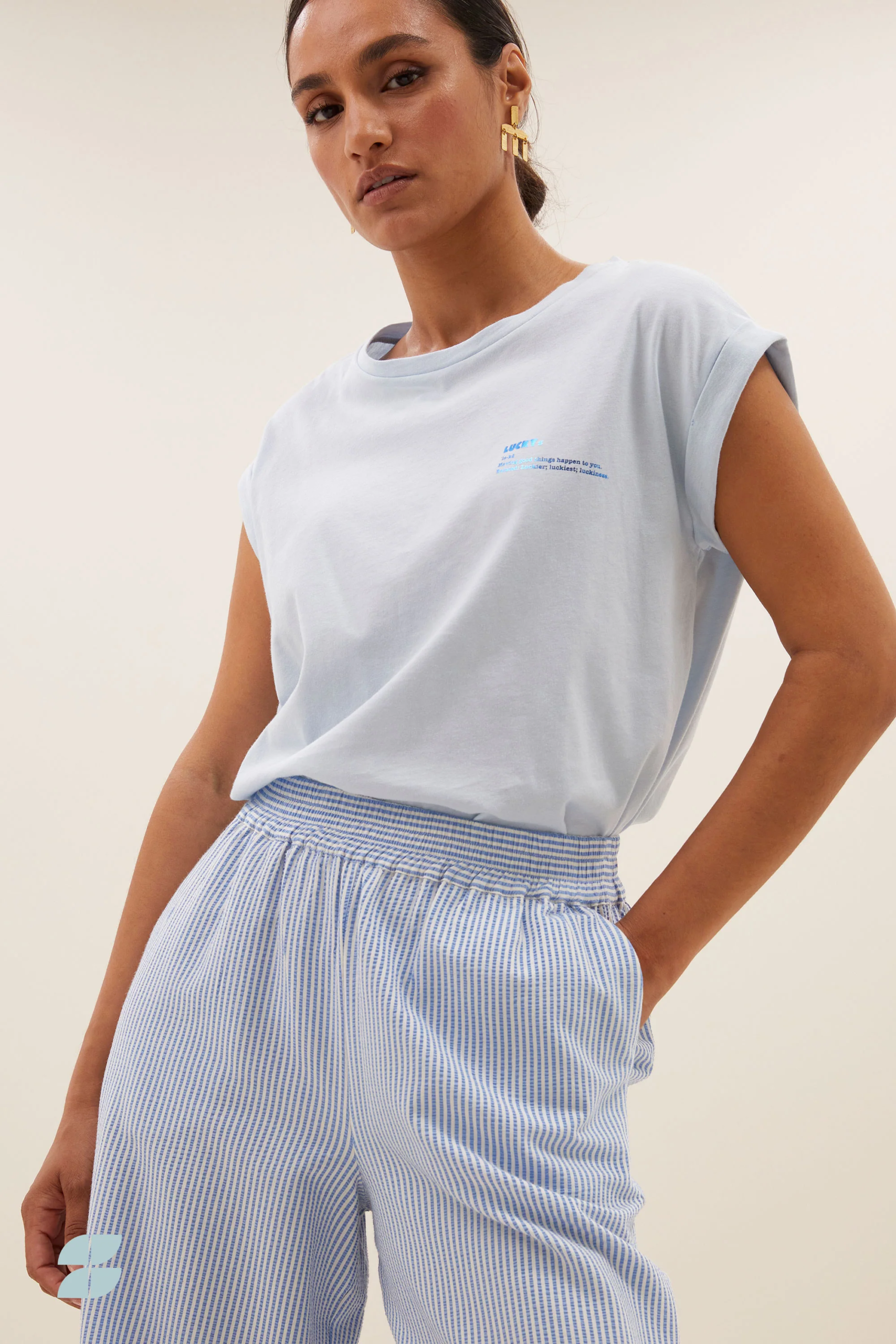 By Bar T-Shirt Thelma dictionary , hellblau. Lässiges T-Shirt mit Rundhals-Ausschnitt und kleinem Print auf der linken Brust. Der Print ist im Wörterbuch-Style, blau-metallic. „ Lucky, having good things happen to you. related: luckier, luckiest, luckiness