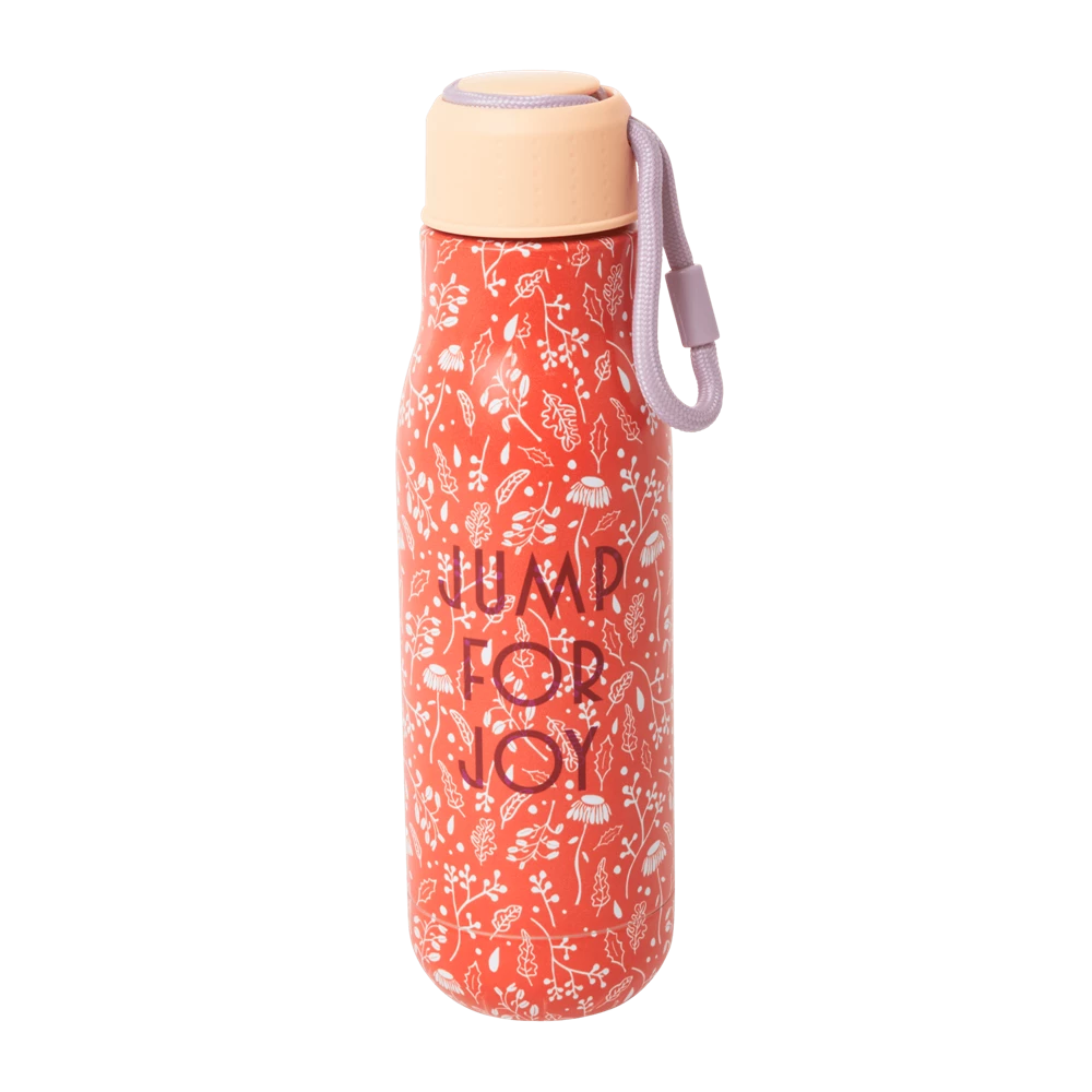 Rice Trinkflasche Rostfreier Stahl Jump for Joy. Trinkflasche für unterwegs mit zartem Pflanzen-Print. Flüssigkeiten bleiben kalt oder warm. Bis zum 500ml. Schraubverschluss. Mit Hilfe der Kleine Schnur kannst du Trinkflasche auch an einer Tasche befestigen.